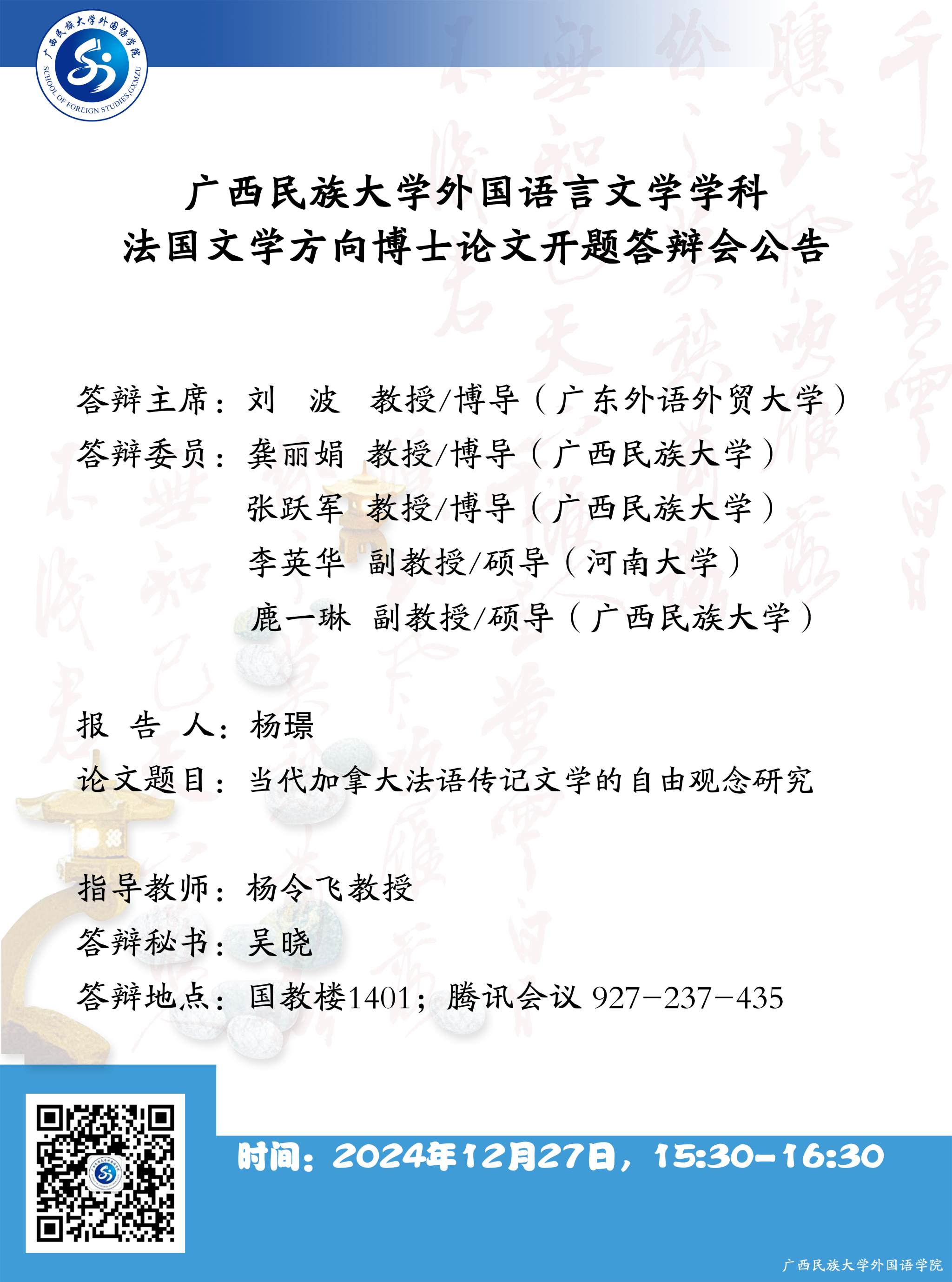 太阳集团tcy8722外国语言文学学科 法国文学方向博士论文开题答辩会公告